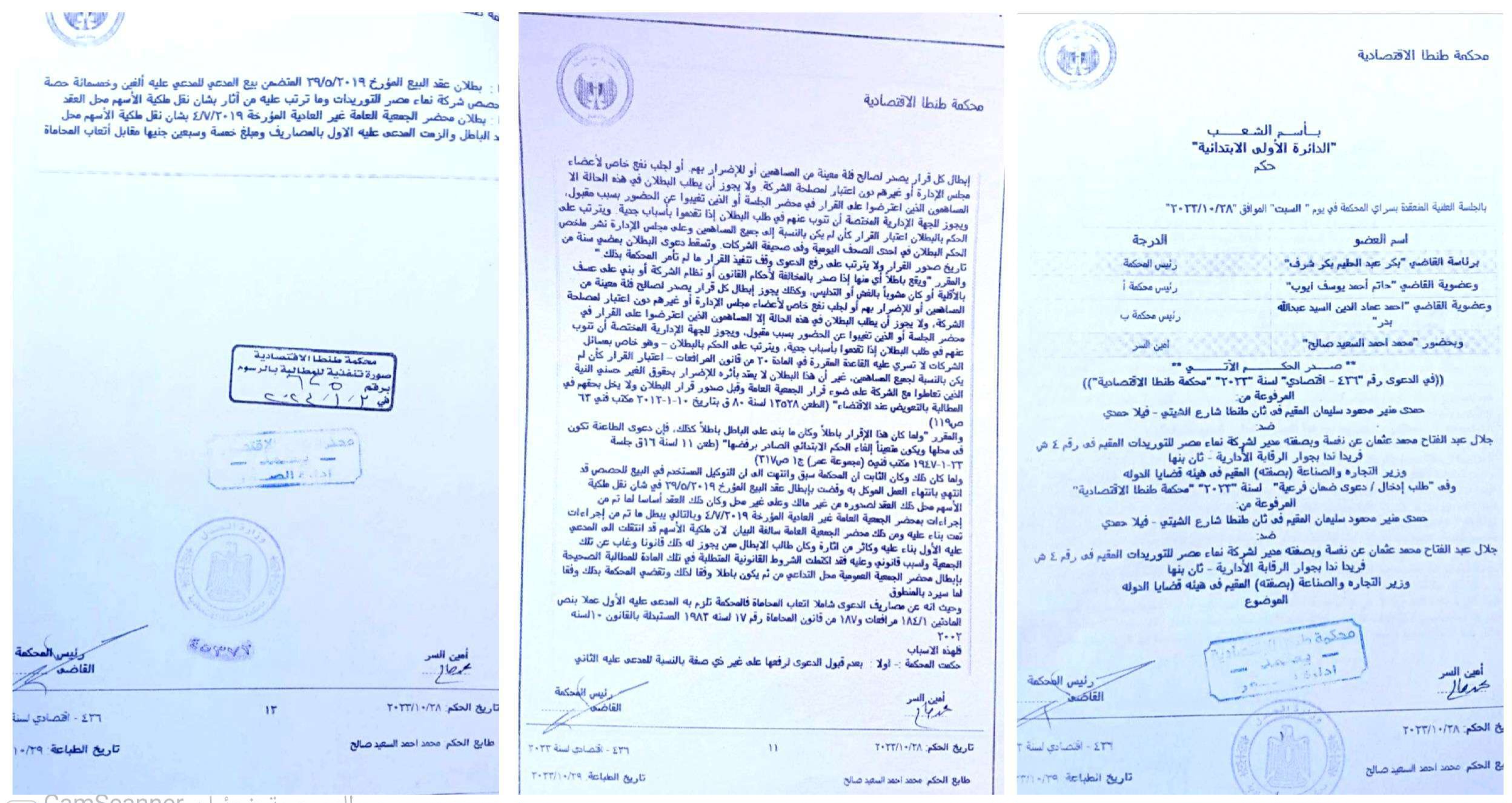 أصدرت محكمة طنطا الاقتصادية حكمًا نهائيًا في القضية رقم 436 لسنة 2023 كلي اقتصادي، قضت فيه بعودة 25% من أسهم شركة «نماء مصر للتوريدات» إلى المالك الأصلي حمدي منير محمود سليمان، بعد ثبوت بطلان التصرفات التي تمت على هذه الحصص بالمخالفة للقانون.