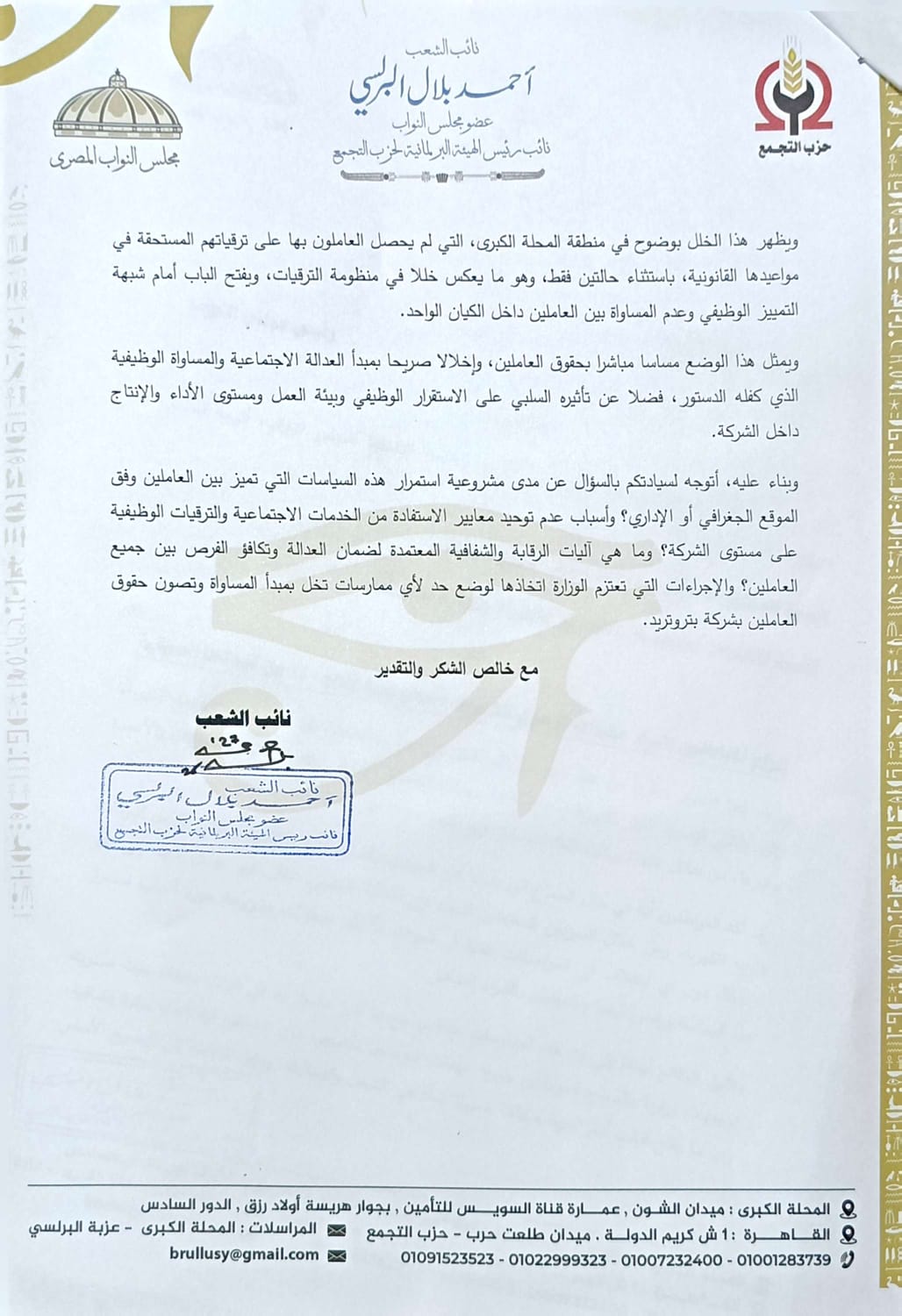 واعتبر النائب أن هذا الوضع يمثل مساسا مباشرا بحقوق العاملين وإخلالًا صريحا بمبدأ العدالة الاجتماعية والمساواة الوظيفية التي كفلها الدستور، فضلًا عن تأثيره السلبي على الاستقرار الوظيفي وبيئة العمل ومستوى الأداء والإنتاج داخل الشركة.