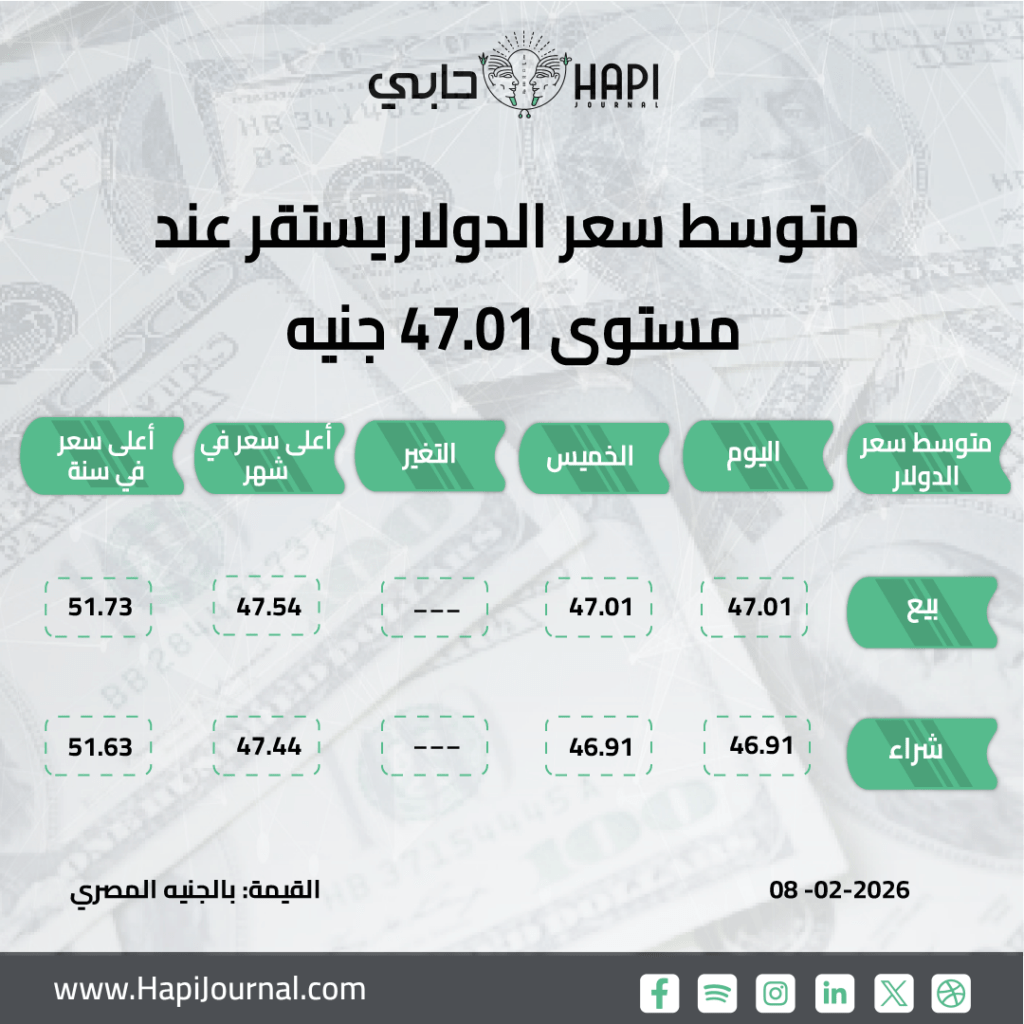 يارا الجنايني– استقر متوسط سعر صرف الدولار أمام الجنيه في ختام تعاملات اليوم الأحد دون تغيير، ليسجل 46.91 جنيه للشراء و47.01 جنيه للبيع، وهي نفس مستويات تعاملات الخميس الماضي، وفقًا لبيانات البنك المركزي المصري.