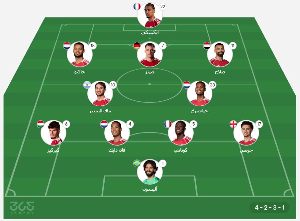 - خط الدفاع: ميلوس كيركز، فيرجيل فان دايك، إبراهيما كوناتي، كورتيس جونز