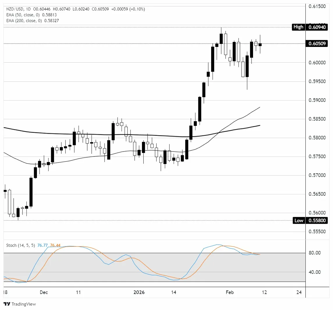 يحافظ الدولار النيوزيلندي على استقراره بالقرب من أعلى مستوياته في عدة أشهر مقابل الدولار الأمريكي بعد صدور تقرير الوظائف غير الزراعية (NFP) الأمريكي يوم الأربعاء والذي أظهر إضافة 130 ألف وظيفة في يناير متجاوزًا التوقعات البالغة 70 ألف ولكن تم طغى عليه من خلال مراجعة سلبية بمقدار 898 ألفًا لبيانات الرواتب لعام 2025 مما يعزز الرؤية حول تدهور سوق العمل الأمريكي كما أن الاحتياطي الفيدرالي (Fed) أبقى على معدلات الفائدة عند 3.50% إلى 3.75% في اجتماعه لشهر يناير والأسواق الآن تسعر تخفيضين إضافيين هذا العام حيث تشير الاتجاهات الضعيفة في سوق العمل إلى مزيد من التيسير.
