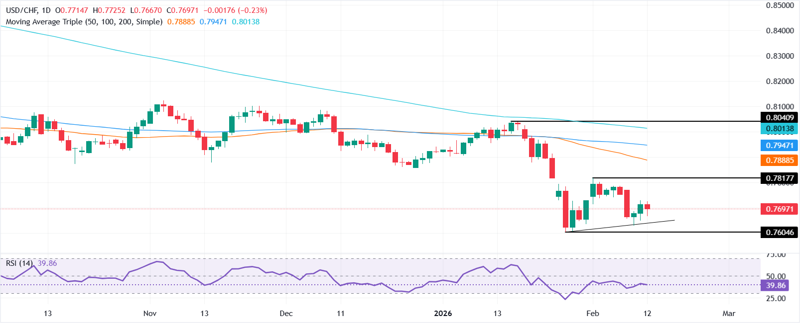 تشير الصورة الفنية إلى أن زوج الدولار الأمريكي/الفرنك السويسري USD/CHF يميل نحو الهبوط، مع تأكيد الزخم الهابط كما يظهره مؤشر القوة النسبية (RSI).
