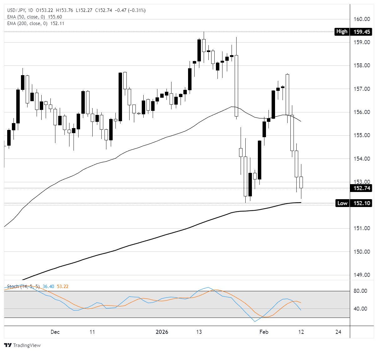 على الرسم البياني اليومي، انخفض زوج الدولار الأمريكي/الين الياباني USD/JPY بشكل حاد من أعلى مستوى له في 7 فبراير/شباط بالقرب من 157.70 لاختبار منطقة 152.50، وهو أدنى مستوى له منذ أوائل يناير/كانون الثاني، وتظهر حركة السعر دافعًا هبوطيًا حادًا مدفوعًا بارتفاع الين بعد الانتخابات، حيث يتم تداول الزوج الآن دون المتوسط المتحرك الأسي لمدة 50 يومًا، مما يؤكد تحولًا هبوطيًا في الاتجاه على المدى القصير، كما يقع المتوسط المتحرك الأسي لمدة 200 يوم أعلى بالقرب من 155.00، وهو مستوى كسره الزوج بشكل حاسم هذا الأسبوع، مما يعزز التحيز الهبوطي، وانخفض مؤشر القوة النسبية (RSI) على الرسم البياني اليومي نحو 35، مقتربًا من منطقة التشبع البيعي ولكنه لم يشير بعد إلى الإرهاق.