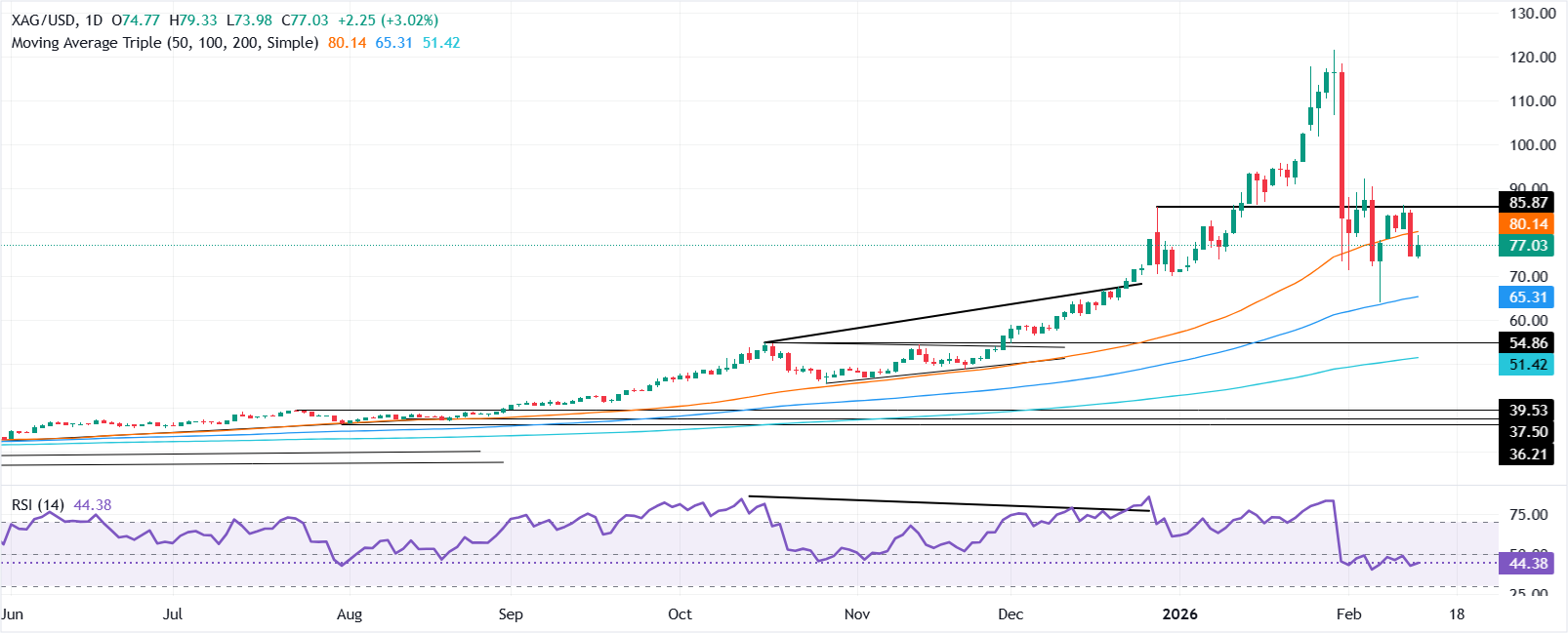 إذا انخفض XAG/USD دون 75.00 دولار، سيكون أول دعم هو أدنى مستوى في 13 فبراير عند 74.01 دولار، وبعد تجاوزه، ستكون المحطة التالية هي الرقم 70.00 دولار، قبل المتوسط المتحرك البسيط لمدة 100 يوم، وفي الاتجاه الصاعد، إذا استعاد XAG/USD 80.00 دولار، ستكون أول مقاومة هي أعلى مستوى في 29 ديسمبر عند 83.75 دولار، قبل أعلى مستوى في 11 فبراير عند 86.30 دولار.