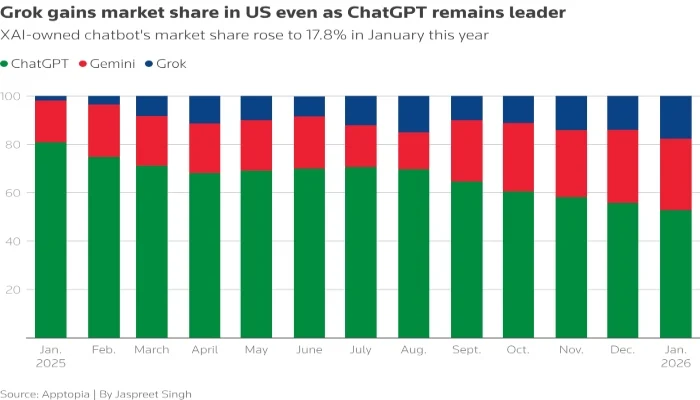 عزز هذا الارتفاع مكانة “جروك” المدمج في منصة التواصل الاجتماعي “X” التابعة لماسك ليصبح ثالث أكثر روبوتات الدردشة استخدامًا في البلاد في يناير بعد “ChatGPT” من OpenAI و”Google Gemini” الذي حلّ في المرتبة الثانية وفقًا لبيانات “أبتوبيا”.