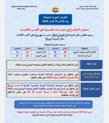 الظواهر الجوية المتوقعة اليوم الإثنين 16 فبراير 2026