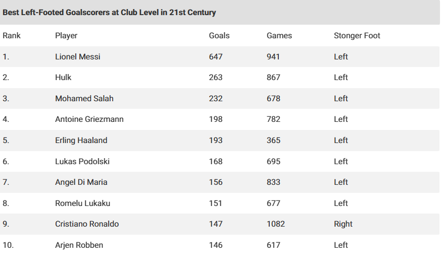 تصدّر الأسطورة الأرجنتينية ليونيل ميسي، نجم إنتر ميامي، القائمة بفارق كبير، بعدما سجل 647 هدفًا بقدمه اليسرى خلال 941 مباراة، مما يؤكد أن قدمه الساحرة كانت وما زالت من أعظم الأسلحة الهجومية في تاريخ اللعبة، بينما جاء البرازيلي هالك في المركز الثاني برصيد 263 هدفًا بقدمه اليسرى في 867 مباراة، مستفيدًا من قوته البدنية وتسديداته الصاروخية.