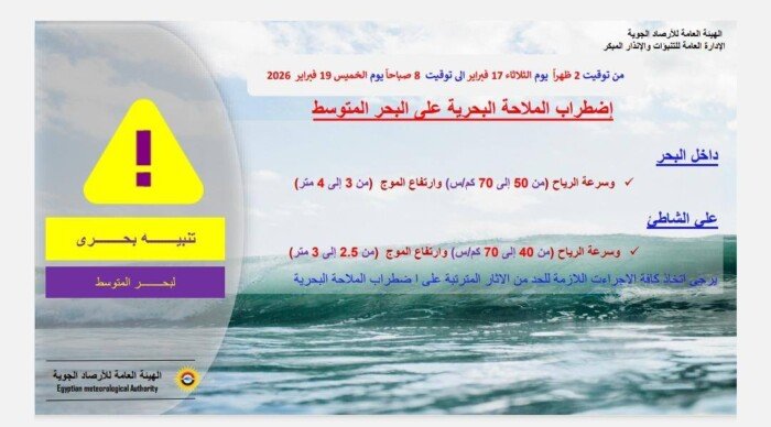تشير توقعات الهيئة العامة للأرصاد الجوية إلى انخفاض ملحوظ في درجات الحرارة غدًا الثلاثاء 17 فبراير 2026 على شمال البلاد حتى شمال الصعيد مع استمرار نشاط الرياح في معظم المناطق مما قد يؤثر على الأنشطة اليومية والحركة العامة.