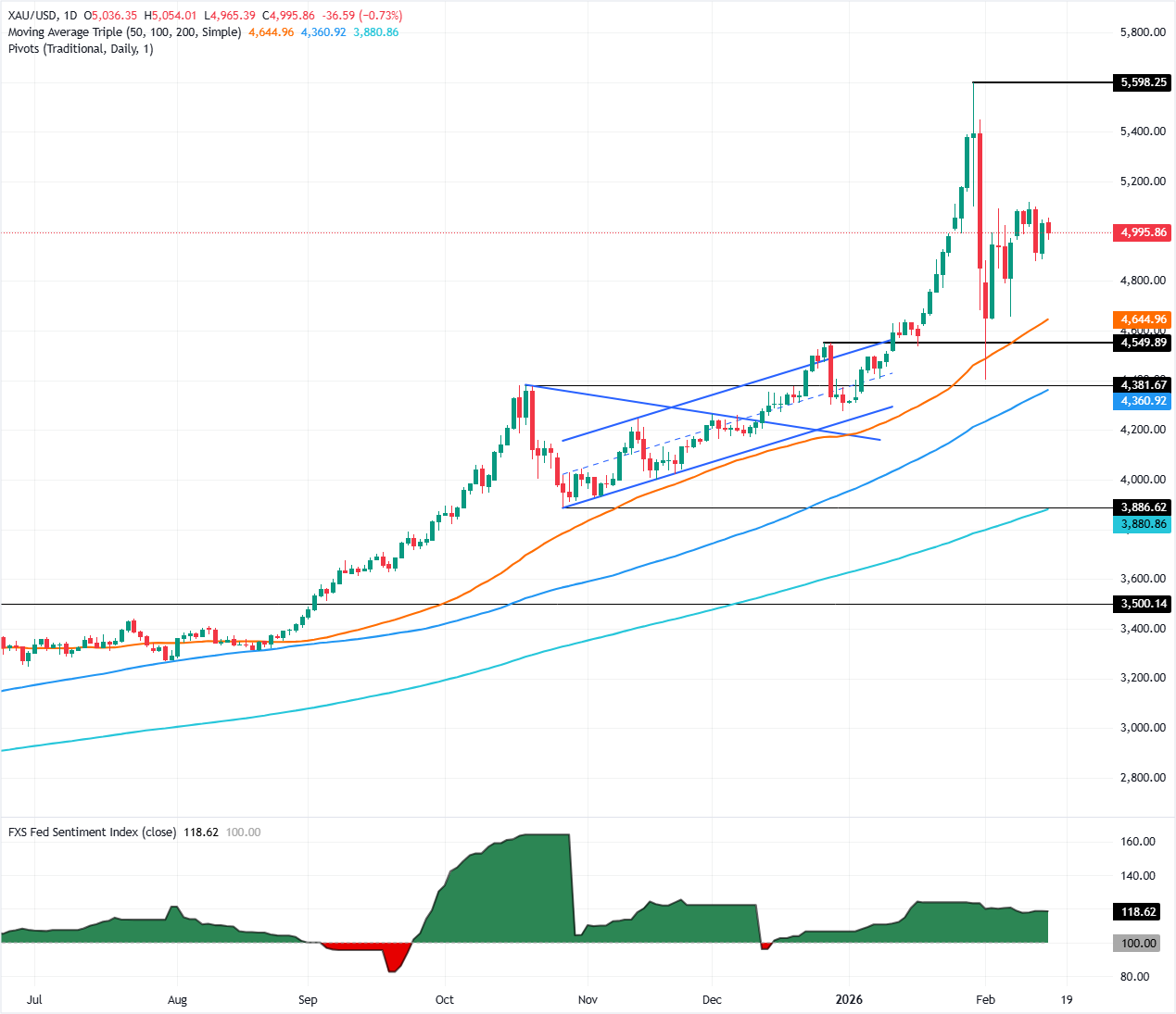 تراجعت أسعار الذهب بنسبة تقارب 1% في جلسة تداول ذات سيولة ضعيفة يوم الاثنين حيث كانت الأسواق الأمريكية مغلقة بمناسبة عطلة يوم الرؤساء بينما ستبقي احتفالات رأس السنة الصينية الأسواق مغلقة لأكثر من أسبوع في وقت كتابة هذا التقرير، يتم تداول XAU/USD عند 4992 دولار بعد أن وصل إلى أعلى مستوى يومي عند 5054 دولار.