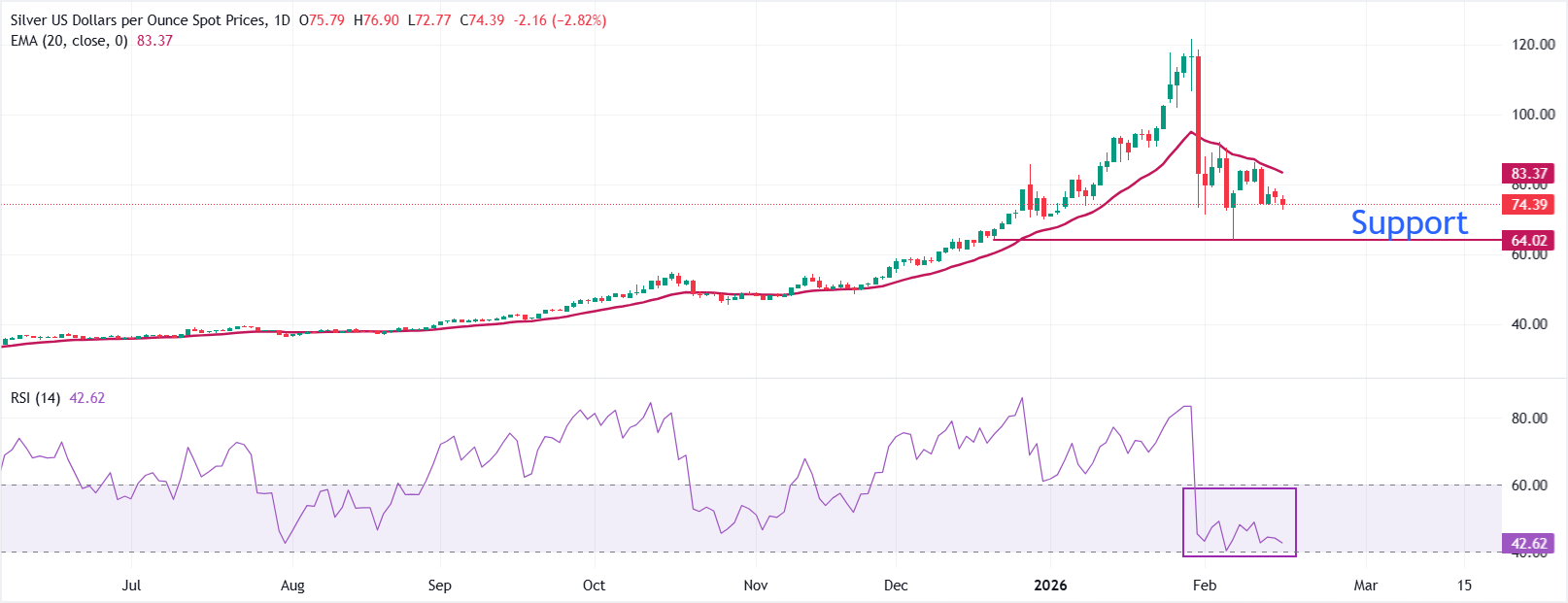 في الرسم البياني اليومي، يتداول زوج الفضة/الدولار XAG/USD عند 74.45 دولار حيث انقلب المتوسط المتحرك الأسي لمدة 20 يومًا ويقع عند 83.38 دولار مما يحد من الارتدادات ويعزز التحيز الهبوطي حيث يبقى السعر دون هذا المقياس مما يحافظ على ضغط الاتجاه نحو الأسفل ومؤشر القوة النسبية RSI عند 42.66 (محايد) ينحدر للأسفل مما يؤكد ضعف الزخم دون ظروف تشبع بيعي.