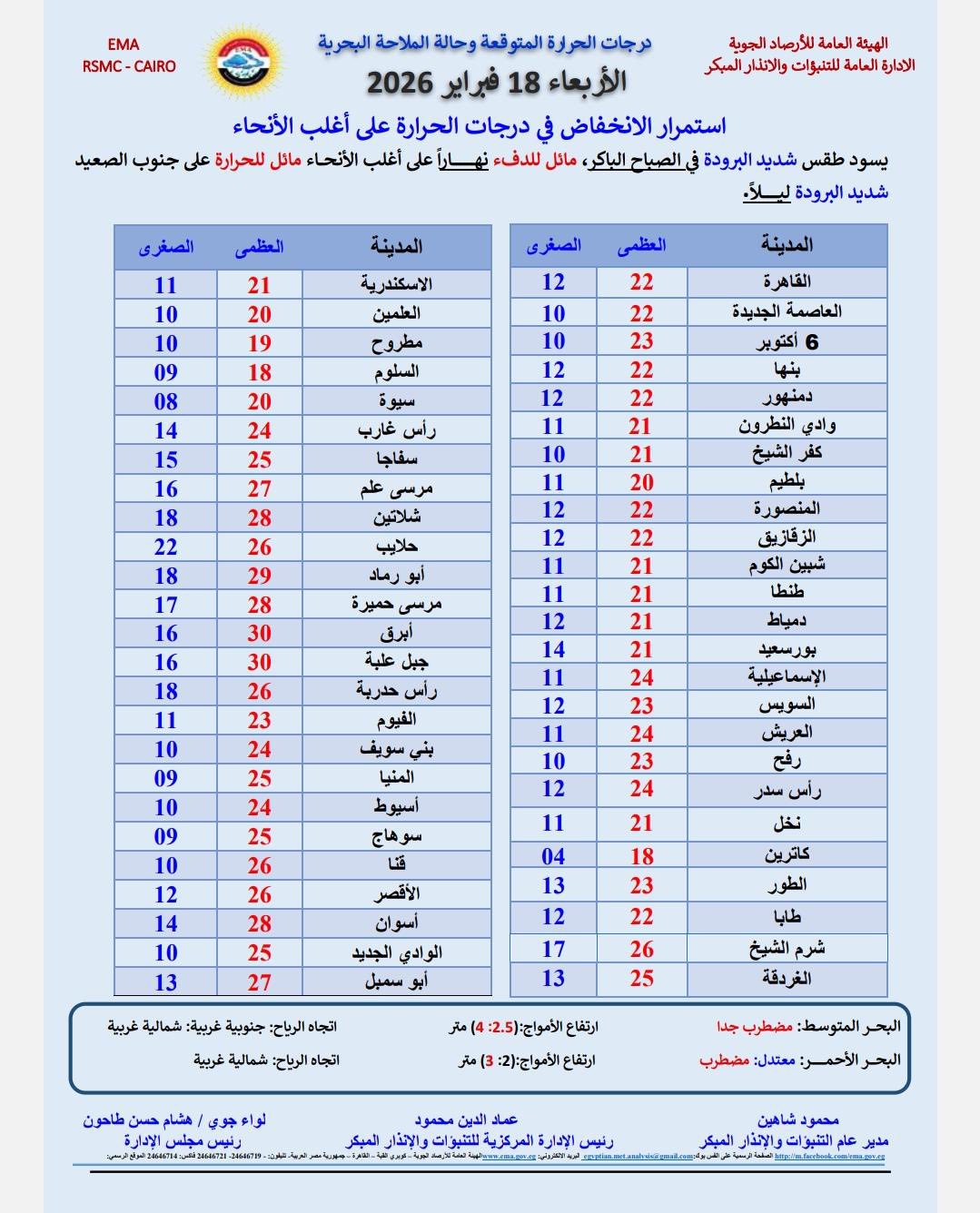 يتوقع خبراء هيئة الأرصاد الجوية غداً الأربعاء استمرار الانخفاض في درجات الحرارة على معظم المناطق حيث يسود طقس شديد البرودة في الصباح الباكر مع اعتدال في درجات الحرارة نهاراً على أغلب الأنحاء بينما يكون الطقس مائلاً للحرارة في جنوب الصعيد مع درجات حرارة شديدة البرودة ليلاً.