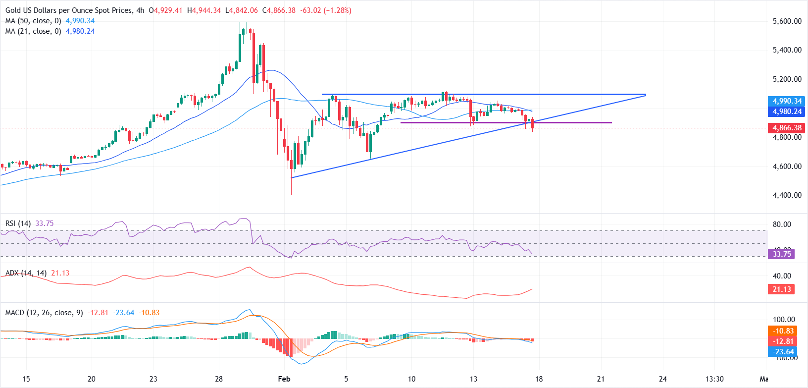 يعمل خط الاتجاه الصاعد لنمط مثلث متماثل بالقرب من 4900 دولار كدعم فوري، وقد يؤدي الاختراق الحاسم دون هذا المستوى إلى تكثيف الضغط الهبوطي، مما يعرض الأهداف الهبوطية التالية عند 4800 دولار، تليها 4700 دولار.
