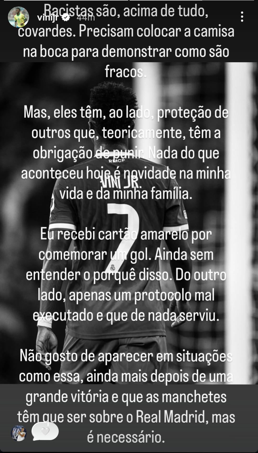 وعقب انتهاء المباراة، نشر فينيسيوس بيانًا عبر خاصية “ستوري” في “إنستغرام” انتقد فيه ما تعرض له واصفًا العنصريين بالجبناء مما يسلط الضوء على التحديات التي يواجهها اللاعبون في الملاعب.