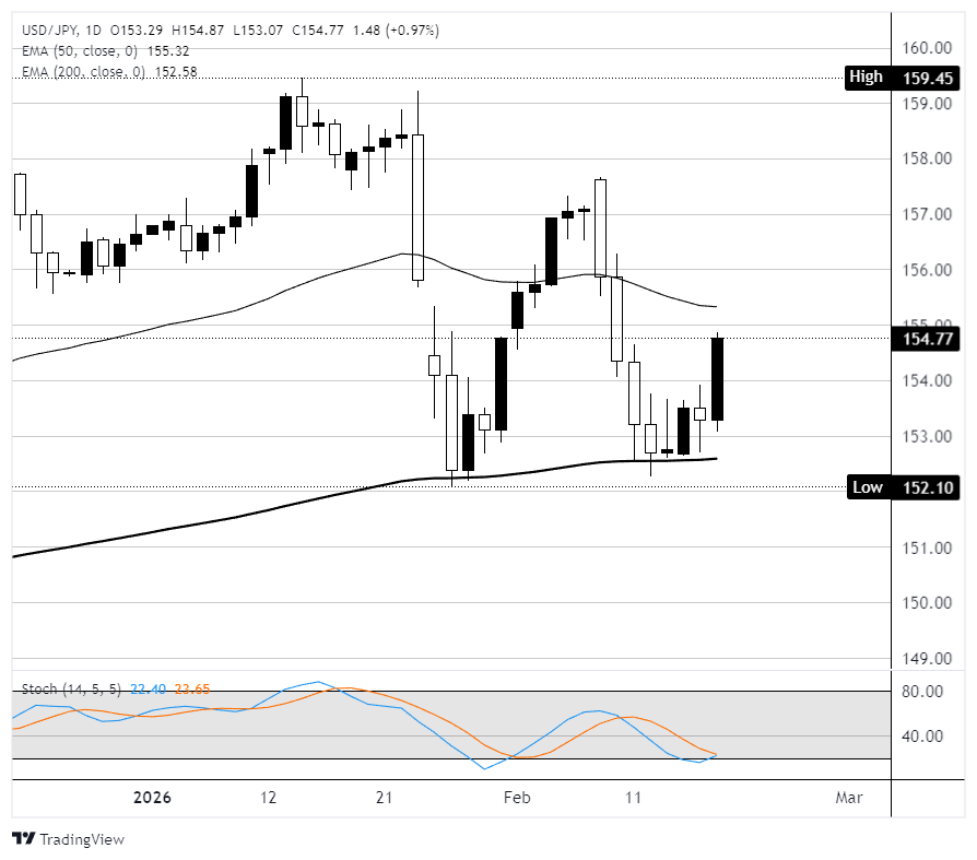 على الرسم البياني اليومي، افتتح زوج USD/JPY يوم الأربعاء بالقرب من مستوى 153.00 قبل أن يرتفع حوالي 1%، حيث أنتج الارتداد شمعة صعودية قوية، لكن السعر توقف تحت المتوسط المتحرك الأسي لمدة 50 يومًا عند 155.30، والذي يعمل كمقاومة فورية، ويقع المتوسط المتحرك الأسي لمدة 200 يوم أدنى بالقرب من 152.60، ويتداول السعر بين المتوسطين، مما يشير إلى أن الزوج في مرحلة انتقالية بعد عمليات البيع الحادة من أعلى مستوى في يناير بالقرب من 159.45، ومؤشر ستوكاستيك يتجه لأعلى من منطقة التشبع البيعي، مما يشير إلى أن الزخم الهبوطي يتلاشى، وقد يتطور ارتداد تخفيفي على المدى القريب، وسيستهدف الاختراق فوق المتوسط المتحرك الأسي لمدة 50 يومًا عند 155.30 مستوى 156.00 ومنطقة التماسك في منتصف يناير، بينما الفشل في تجاوزها سيترك الزوج عرضة لإعادة اختبار دعم 153.00 وأدنى مستوى منذ بداية العام عند 152.10.
