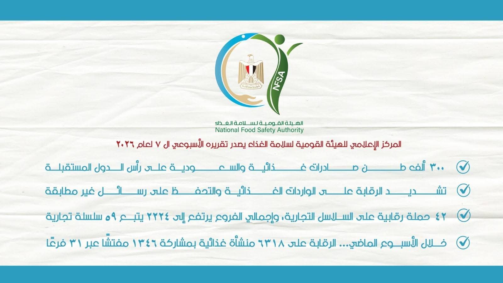 أصدر المركز الإعلامي للهيئة القومية لسلامة الغذاء تقريره الأسبوعي السابع لعام 2026، وذلك عن الفترة من 14 – 20  فبراير 2026، والذي تضمن العديد من الأنشطة المختلفة على النحو التالي: