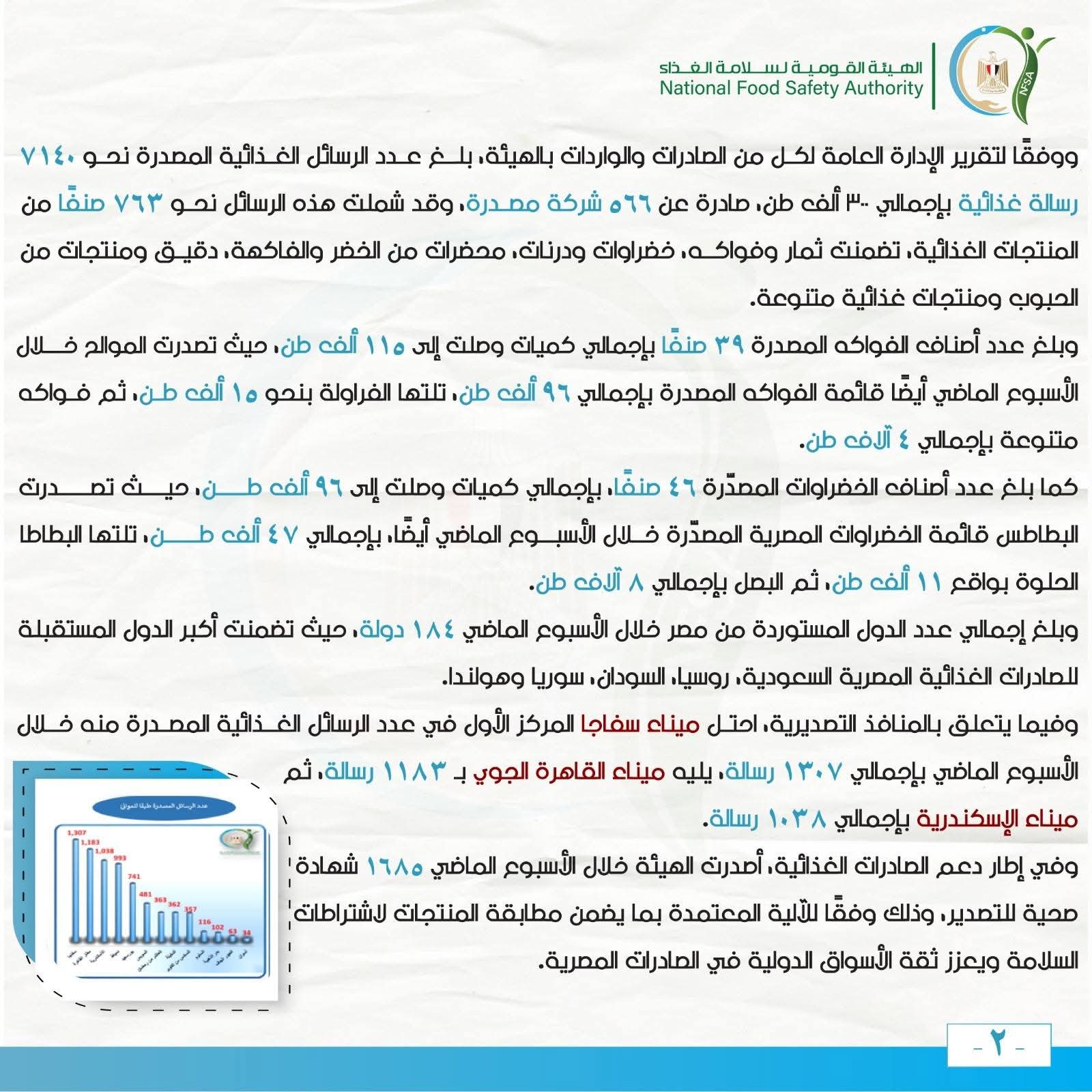 وبلغ إجمالي عدد الدول المستوردة من مصر خلال الأسبوع الماضي 184 دولة، حيث تضمنت أكبر الدول المستقبلة للصادرات الغذائية المصرية السعودية، روسيا، السودان، سوريا وهولندا.
