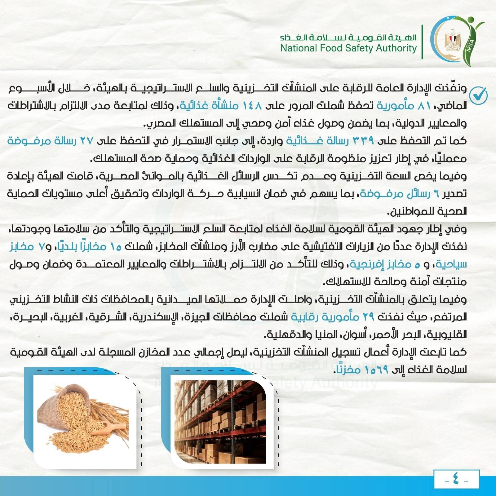 ونفّذت الإدارة العامة للرقابة على المنشآت التخزينية والسلع الاستراتيجية بالهيئة، خلال الأسبوع الماضي، 81  مأمورية تحفظ شملت المرور على 148 منشأة غذائية، وذلك لمتابعة مدى الالتزام بالاشتراطات والمعايير الدولية، بما يضمن وصول غذاء آمن وصحي إلى المستهلك المصري.