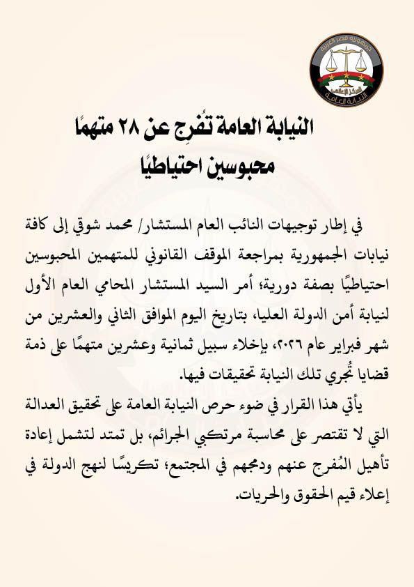 في إطار توجيهات النائب العام المستشار محمد شوقي إلى كافة نيابات الجمهورية بمراجعة الموقف القانوني للمتهمين المحبوسين احتياطيًا بصفة دورية؛ أمر السيد المستشار المحامي العام الأول لنيابة أمن الدولة العليا، بتاريخ اليوم الموافق الثاني والعشرين من شهر فبراير عام ٢٠٢٦، بإخلاء سبيل ثمانية وعشرين متهمًا على ذمة قضايا تُجري تلك النيابة تحقيقات فيها.
