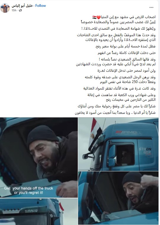 وقال خليل أبو إلياس من خلال منشور له عبر موقع التواصل الاجتماعي فيسبوك: اصحاب الارض في مشهد مع إبن المنيا يُبينُ لك غضب المصريين عموماً والصعايدة خصوصاً، ويُظهرُ لك شهامة الصعايدة في التصدي للاحـتلال، وقد حدثَ هذا الموقفُ بالفعلِ مع سائق احدى الشاحنات، الذي إستفزه الاحـتلال، وأرادوا أن يعيدوه بالإغاثات.