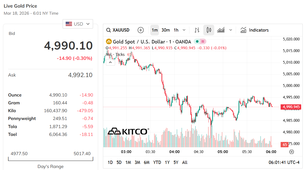 هبطت أسعار الذهب العالمية تحت حاجز 5000 دولار للأونصة في تداولات 18 مارس، وسط زيادة ضغوط البيع وتقلبات واسعة النطاق، حيث سجل الذهب الفوري نحو 4990.1 دولار بانخفاض 0.3%، مع تحركات متذبذبة بين 4977.5 و5017.4 دولار، ما ينذر بإمكانية تصحيح أعمق لسعر المعدن النفيس تبعاً لقرارات السياسة النقدية القادمة والتحديات الجيوسياسية القائمة.