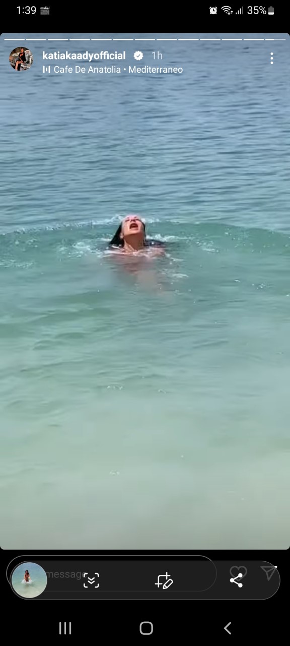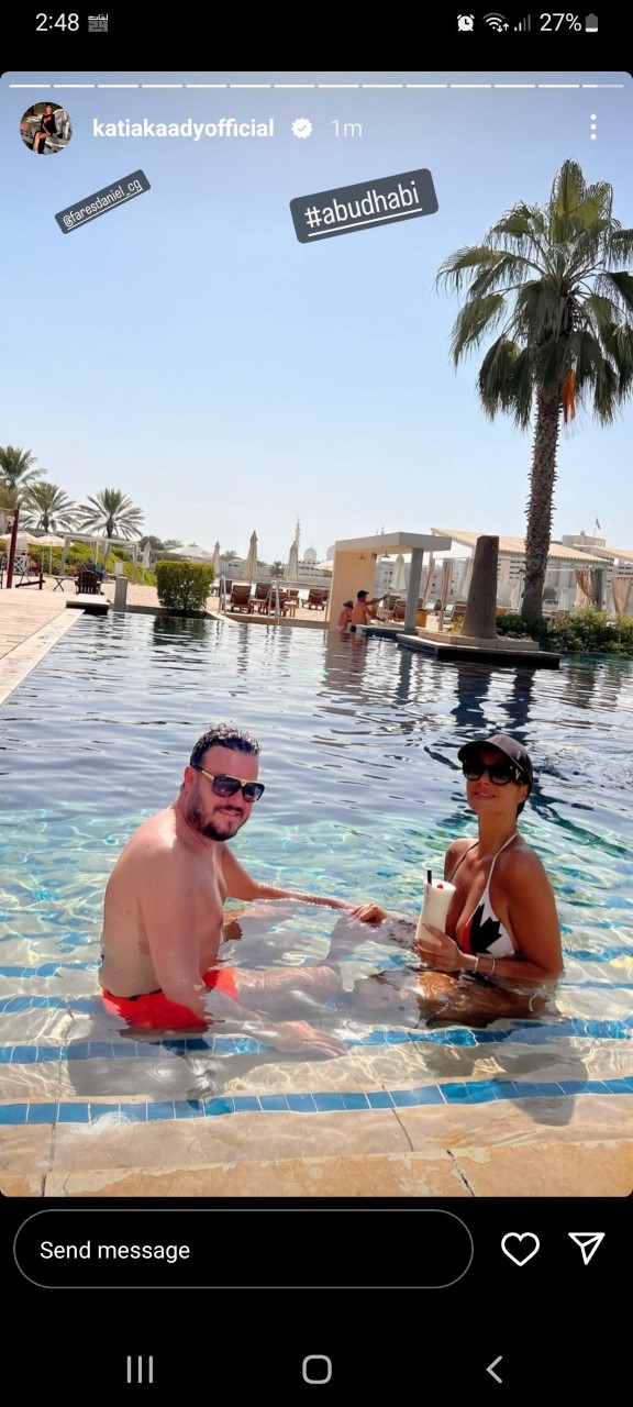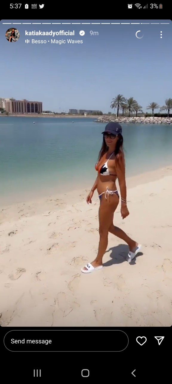 وظهرت كاتيا التي تقضي إجازة مع زوجها فارس دانييل في أبو ظبي وهي تستمتع بوقتها ببكيني مُثير على الشاطئ.