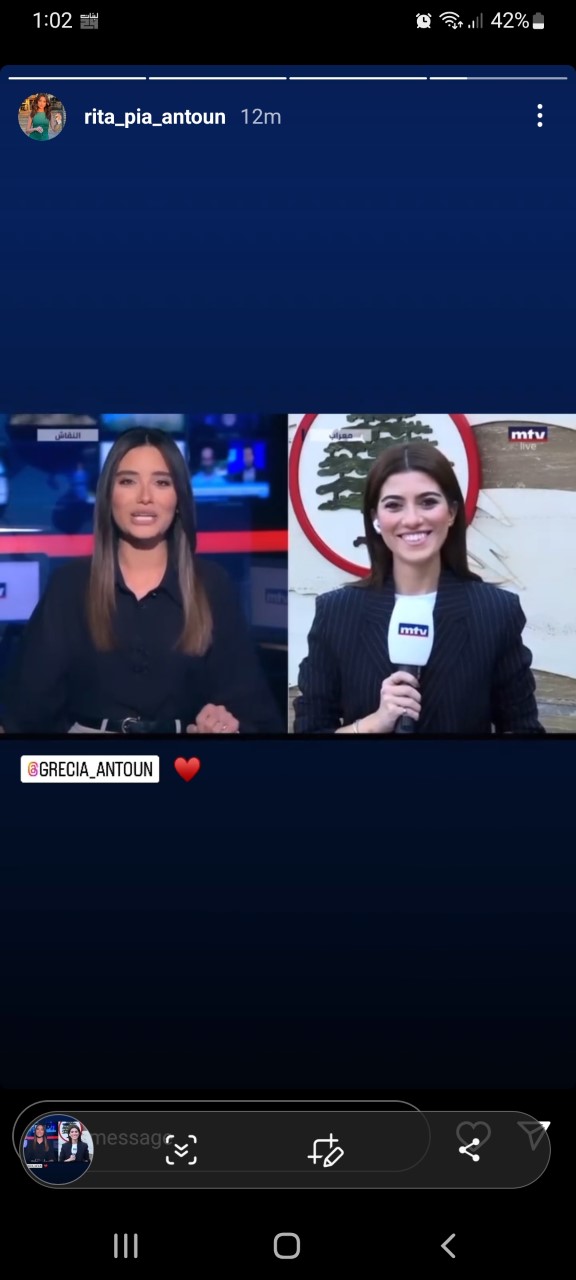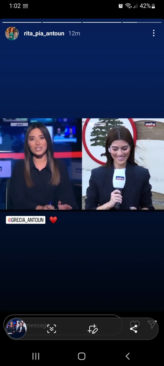ورحبت ريتا بيا بشقيقتها عبر شاشة الـ mtv قائلة: “تنضم إلينا من معراب الزميلة العزيزة الشقيقة غريسيا أنطون”، مشيرة إلى ان “الشاشة اللبنانية قد اشتاقت لها”.