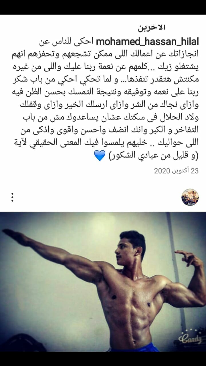في إطار متابعة جريدة ‘ مشاهير العرب ‘ لأحد أفضل الشباب المؤثرين في وقتنا الحالي يجب أن نسلط الضوء علي الشاب المكافح الطموح ” محمد حسن ” صاحب الستة وعشرون عاما ، والذي لم يستسلم للأعمال الروتينية فقرر أن يقتحم مجال كمال الأجسام