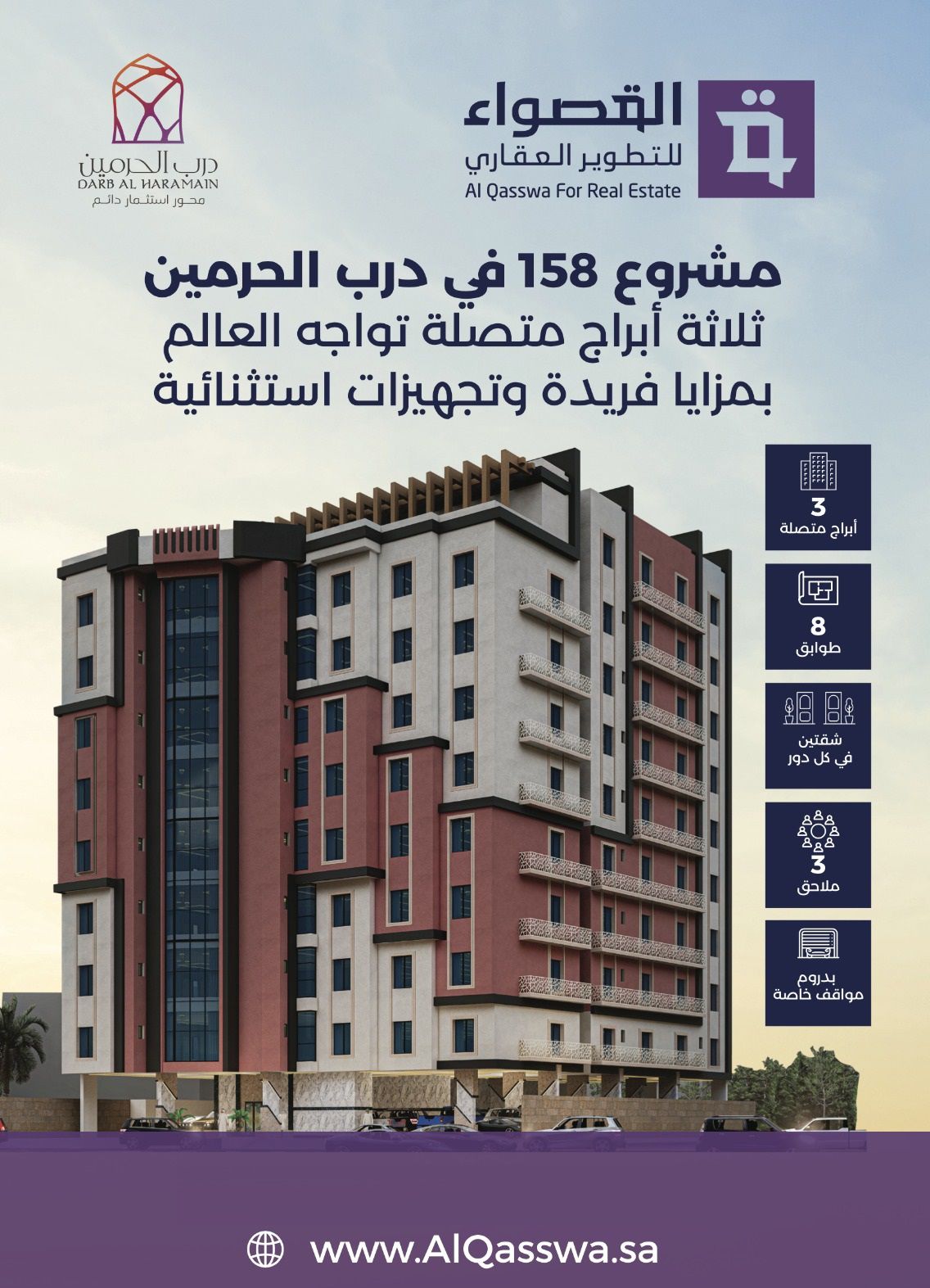 شركة القصواء للتطوير العقاري تُعلن البدء عن المرحلة الأولى من بيع الوحدات العقارية لمشروعها في مخطط درب الحرمين والذي تم تسميته بمشروع 158 ، وهو مشروع عقاري جديد يأخذ مفهوم الجودة والفخامة إلى آفاق جديدة .